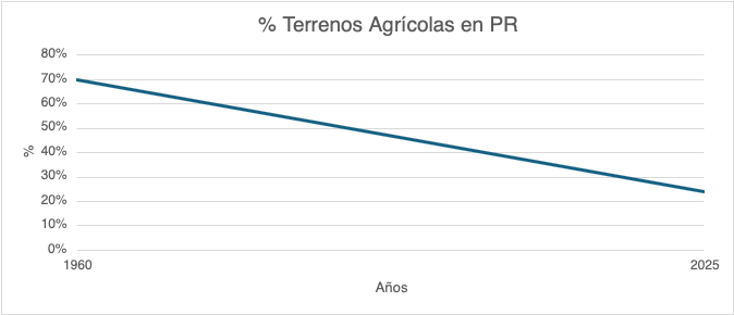 Para los años del 1960, más del 70% del territorio puertorriqueño era de agricultura. Actualmente, menos del 24% de la isla se clasifica como terreno agrícola, según estimaciones del Departamento de Agricultura y el Instituto de Estadísticas de Puerto Rico. Esto es algo muy triste, lo que hay de terrenos agrícolas es casi 1/3 de lo que teníamos antes.